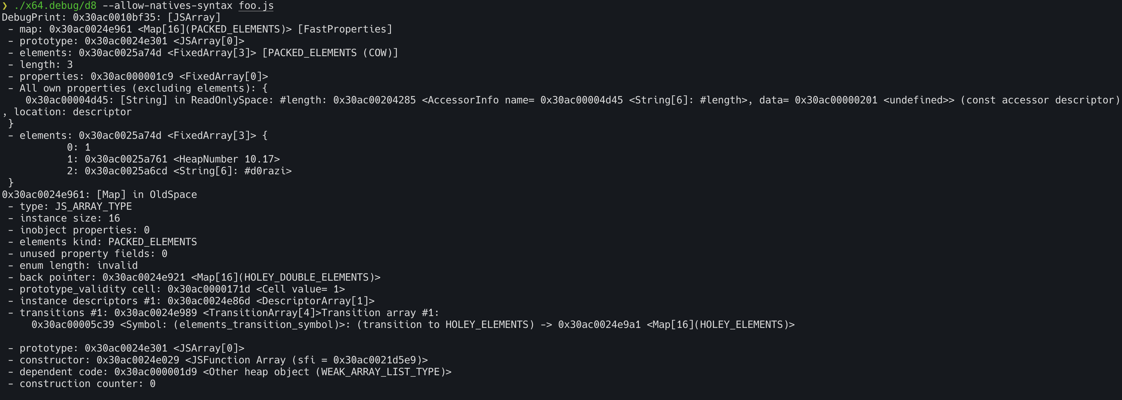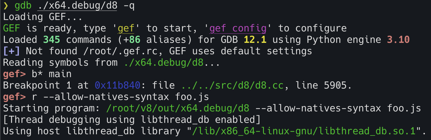 먼저 gdb ./x64.debug/d8 -q를 사용하여 gdb를 실행해준다. 그리고 r --allow-natives-syntax foo.js 명령어로 원하는 파일을 실행해주면 된다.