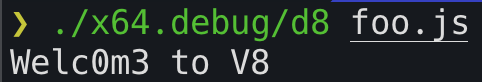 console.log("Welc0m3 to V8");이후 ./x64.debug/d8 foo.js 명령어를 사용하게 되면, 우리가 빌드한 d8 파일이 foo.js 코드를 실행해줍니다.