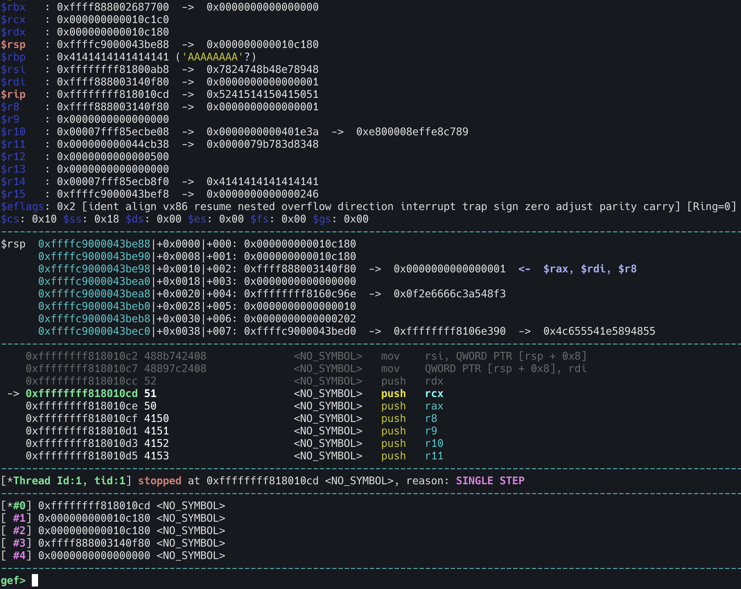 R10: 4141414141414141 R11: 4141414141414141 R12: 0000000000000410