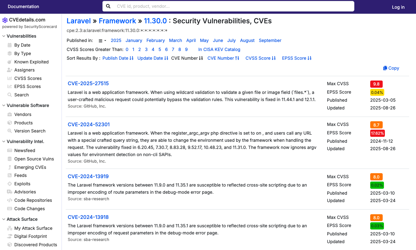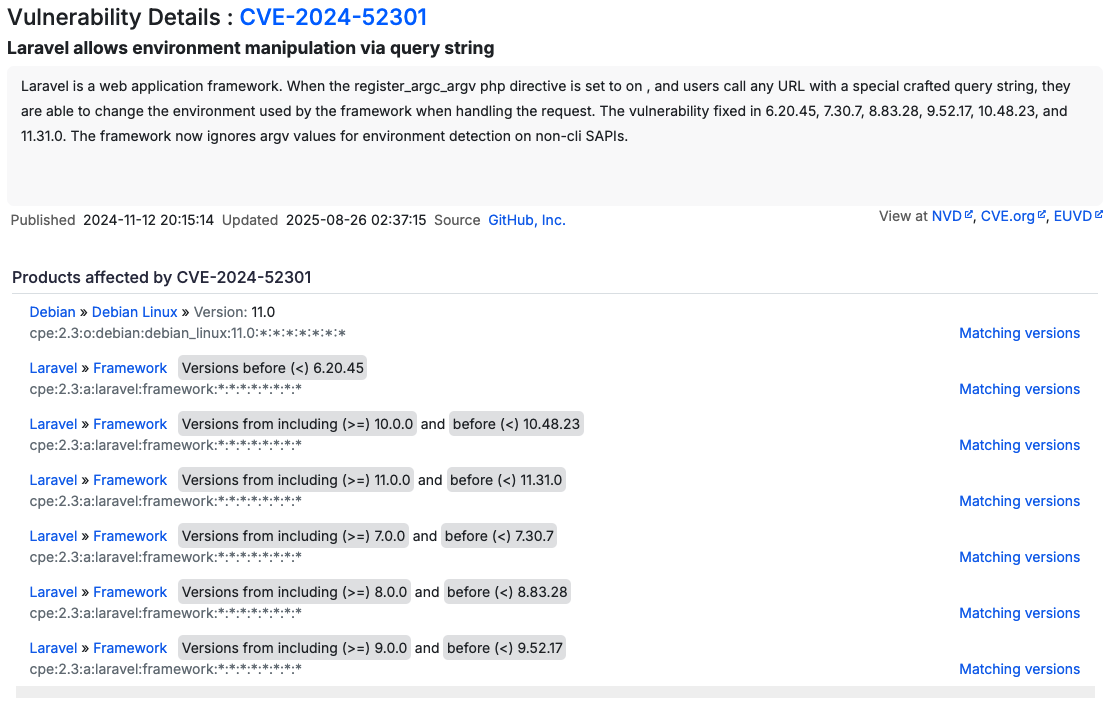 }그래서 환경변수를 조작하는걸 목표로 Laravel 11.30.0 버전 취약점들을 찾아봤습니다.