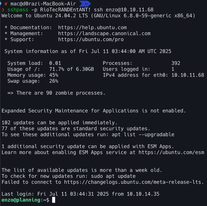 얻은 계정 정보로 서버에 ssh 접속을 시도했는데 정상적으로 로그인이 됐습니다.
