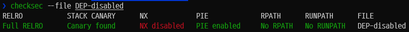 readelf -W -l ./DEP-disabled |grep ‘GNU_STACK’ | grep ‘RWE’