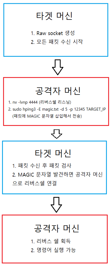 - 매직 패킷이 존재하면 리버스쉘 연결