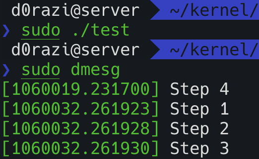 module_exit(example_exit);example_open()의 printk("Step 2")와 printk("Step 3") 사이의 딜레이를 주고 싶으면 어떻게 해야 할까? sched_setaffinity 시스템 호출을 호출하면 된다. (다음 코드는 ExpRace 논문의 기본 코드를 기반으로 작성함):